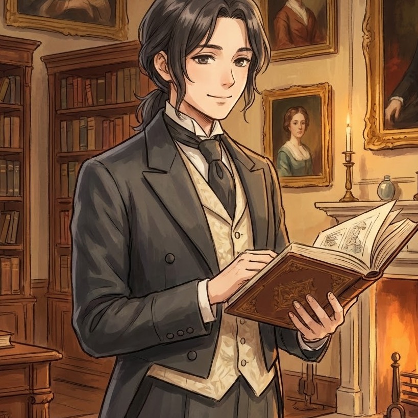 暖炉のある部屋と、本を読む老紳士/淑女